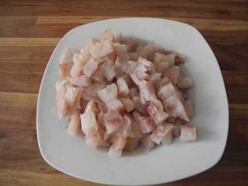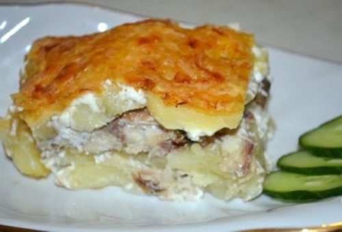 Філе нарізати маленькими шматками, скласти в тару, засипати сіллю і спеціями, залишити на короткий час. Очищений картопля поділити на дві частини, потім нарізати тонкими шматочками. Шматки укласти в іншу тару, змішати з сіллю і перцем і залишити.