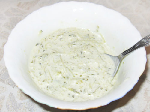 На погретую сковороду кладемо вершкове масло і розтоплюємо його, потім додаємо туди сметану з борошном. Скільки потрібно борошна – залежить від густоти сметани, якщо вона зовсім рідка, то знадобляться 2 ложки. Приправляємо суміш половинкою зубчики часничку, зеленню і прянощами. Тушкуємо все буквально 1-2 хвилини і гасимо вогонь. Соус може подаватися окремо або використовуватися як маринад для рибки.