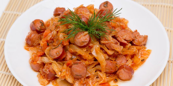 Відмінний варіант бюджетного, ситного і смачного страви – білокачанна капуста тушкована, присмачена сосисками, сардельками або вареною ковбасою. Таке блюдо оцінять і діти, і голодні чоловіки, крім того, його можна приготувати про запас на тиждень і розігрівати в міру необхідності.