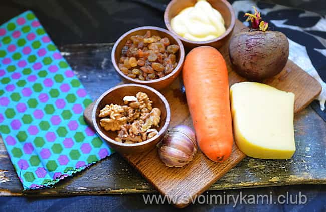 Морква200 гМолодий часник2 зубчикиБуряк250 гСир100 гІзюм70 гЧорнослив50 гМайонез100 млМелена зелень25 гЧорний мелений перець5 гКурага50 гМелений волоський горіх50 г