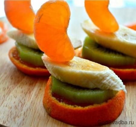 Мандарини і ківі нарізати на кільця, банани нашарувати як би на овали, щоб отриманий шматочок займав велику площу. Далі все розкладаємо так: гурток мандарини, ківі і банан. Протикаємо їх зубочисткою під кутом. А у стирчить кінчик зубочистки встромляємо мандаринову часточку, імітуючи човновий парус. Так проробити з усіма заготовками. І закуска «Фруктова човен» готова! Приємного апетиту.
