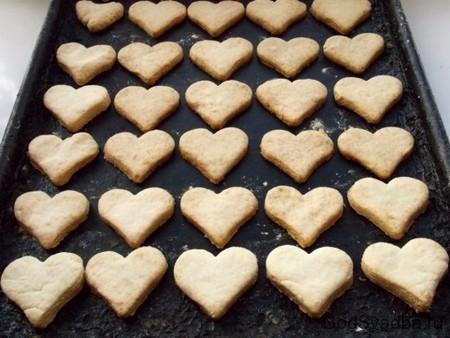 У духовці доводимо температуру до 180-200°С і випікаємо приблизно 5-10 хвилин (готовність визначте за золотисто помаранчевому колеру тесту). Маленькі сердечка вирізати за раніше наміченим контуру.