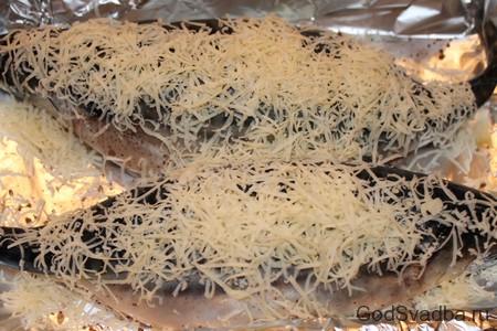 - Сир потерти і закласти їм рибін, відправивши їх потім в піч на половину години. Температуру виставити в 180, може 200 градусів в залежності від ступеню прогріву вашого духової шафи.