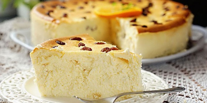 Більш повітряної консистенцією має сирна запіканка з кефіром, який надає страві вишукану м’якість і ніжність за рахунок наявності бульбашок газу. Традиційними добавками стануть ванілін і родзинки, відрізняються солодкістю і легкою кислинкою смаку. Така страва прикрасить повсякденний раціон, святковий стіл, підійде для десерту або дитячого сніданку.