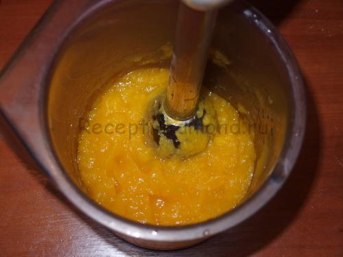 Подрібніть гарбуз блендером до стану пюре. Зізнаюся чесно — запіканку я готувала перший раз і 800 гр сирого гарбуза, яка заповнила всю чашу мультиварки, мені здалося більш ніж достатньо. Але коли вона перетворилася в пюре, то обсяг маси викликав у мене деякі сумніви. В результаті все вийшло як треба, але якщо ви вирішите додати ще пару шарів, гарбуза треба брати більше.