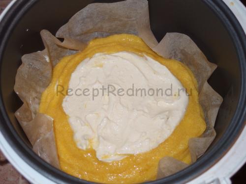 Збийте блендером сир, по 2 ст. ложки цукру, манки, одне яйце і пакет ванільного цукру. Маса вийде набагато густіше, ніж гарбузова, тому для більш рівномірного розподілу в чаші я додала ще столову ложку рідини, що залишилася від гасіння гарбуза.