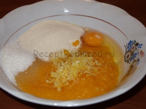 Додайте гарбузове пюре по 2 ст. ложки цукру, манки, цедру лимона і одне яйце. Мене трохи спантеличила вийшла консистенція (як на мене дуже рідка) і я від себе поклала столову ложку крохмалю. У первісному рецепті його не було. І з приводу цукру — 2 столові ложки це не дуже солодкий смак. Якщо ви любите більш — сміливо кладіть ще.