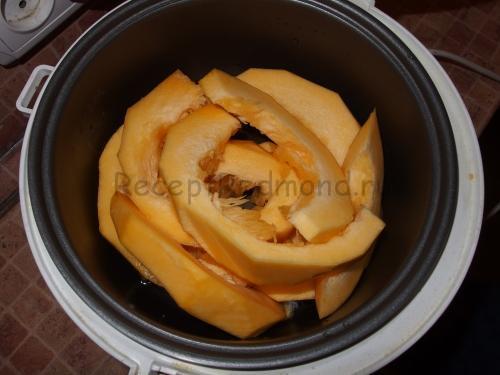 Очистіть і наріжте скибочками гарбуз. Протушкувати її в мультиварці на однойменному режимі протягом 20 хвилин. Щоб вона не пригоріла, я додала на дно чаші 50 мл води.