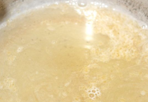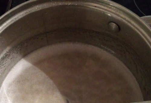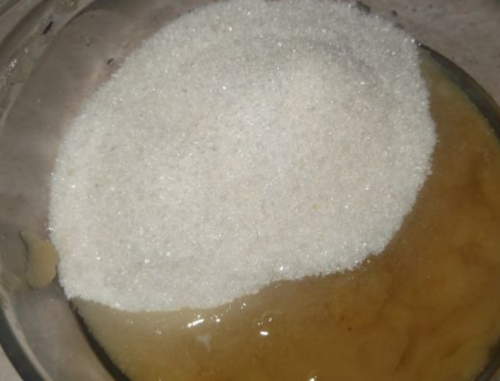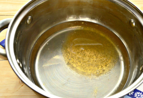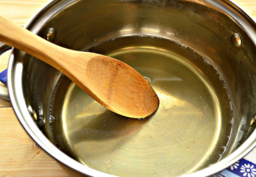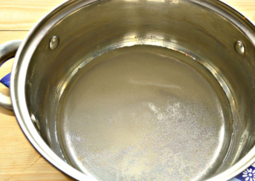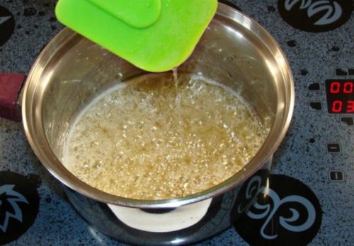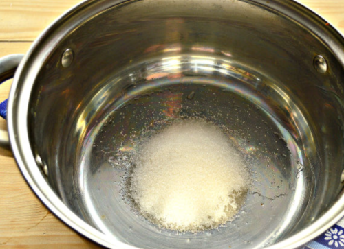 - У ємність пересипаємо дрібний цукор, вливаємо сюди ще воду 1 ст. Очікуємо, кристалики повинні розчинитися. Відразу кип’ятимо рідину, постійно помішуємо.