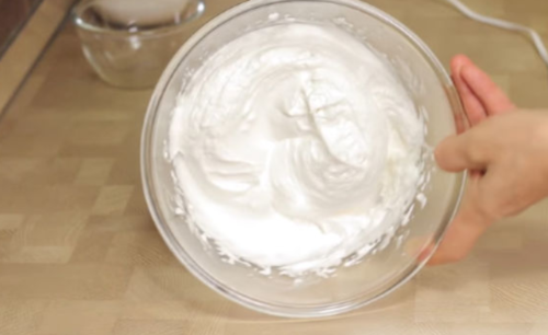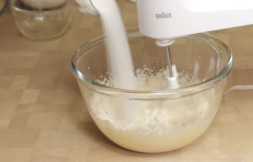- Додаємо білок, всипаємо дрібний цукор, продовжуємо помішувати до отримання однорідної і пишною суміші.