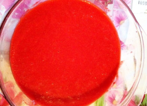 - Замочуємо в прохолодній воді агар-агар. Збиваємо ягоди полуниці блендером і перетираємо через сито, має вийти пюре.