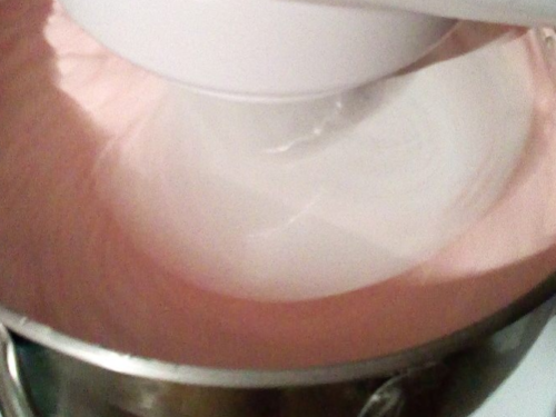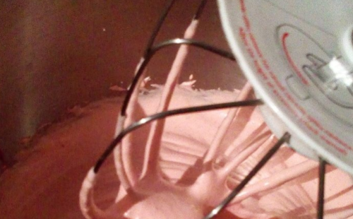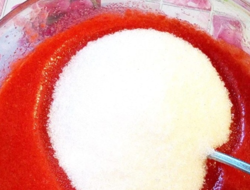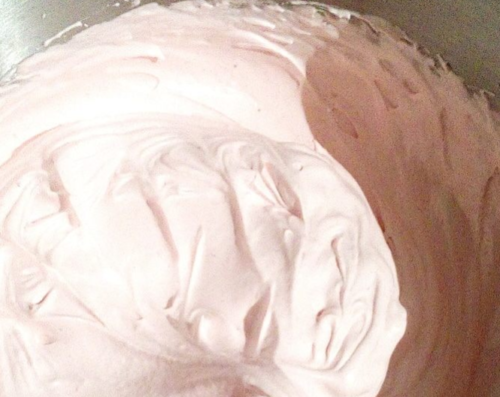 - У чашу відкладаємо малинове пюре 130 г, всипаємо цукор, додаємо білок. Пюре збиваємо до міцної стійкої маси.