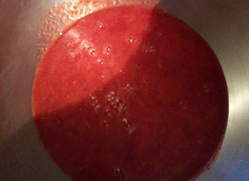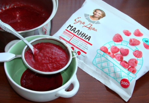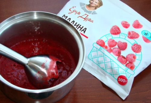 - Розморожуємо ягоди малини або швидко прогріваємо в сотейнику, а потім перетворюємо в однорідну масу, перетираємо, повинно вийти пюре без кісточок.