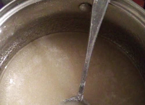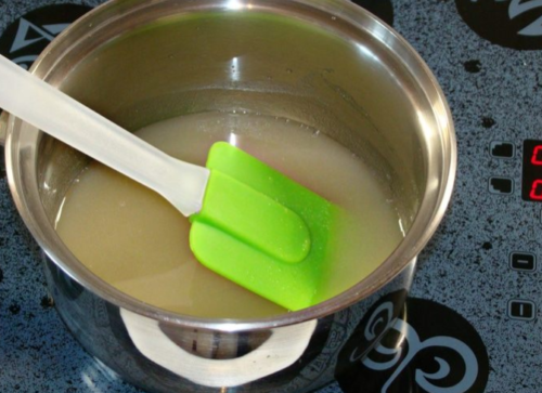 - Варимо хвилину, а потім сюди ж пересипаємо желатин, відключаємо вогонь. Повинна вийти желатинова суміш.