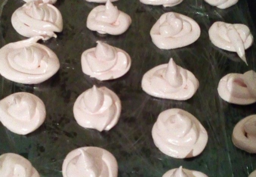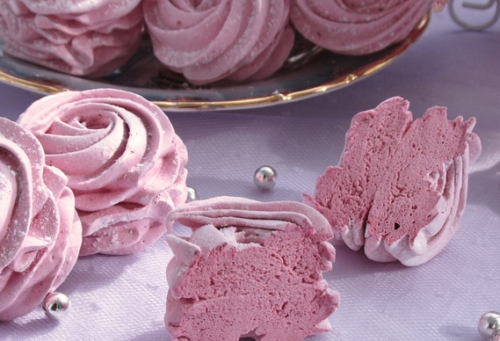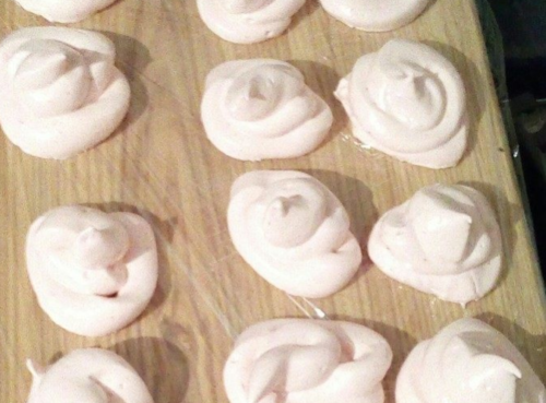- В полуничну суміш перекладаємо зварену цукрову рідина, збиваємо до густоти. Перекладаємо все в кондитерський мішечок, розкладаємо зефір на папір або деко, просушуємо.