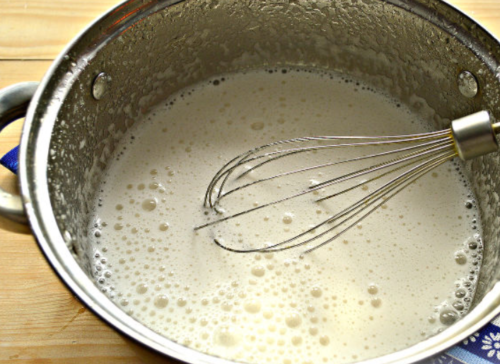 - Відвар виливаємо в сотейник, сюди ж додаємо агар-агар, перемішуємо. Пюре з яблук збиваємо до світлого відтінку.
