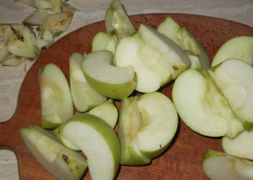 - Обполіскуємо яблука, видаляємо насіння, нарізаємо шматочками, перекладаємо в ємність, ставимо на вогонь, варимо, накривши кришкою 40 хвилин. Фрукти повинні придбати м’якість.