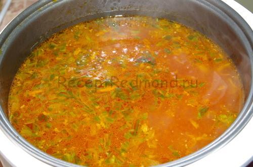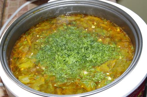 Останній етап — кріп і яйця. Дочекайтеся закипання і можна вимикати мультиварку і закривати кришку, щоб борщ трохи настоявся.