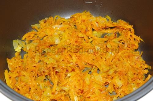 На режимі смаження протягом 15 хвилин пасеруйте цибулю і моркву до золотистого кольору.