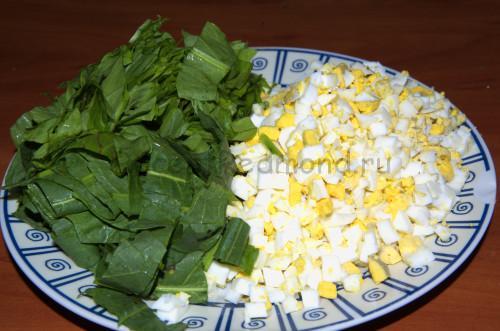 Наріжте кубиками яйця (якщо їх терти на тертці, борщ буде зовсім інший) і не дуже дрібно щавель. Я кладу стільки яєць, тому що тоді смак зеленого борщу виходить особливий. Але, в принципі, я зустрічала рецепти, в яких використовуються лише два яйця на каструлю.