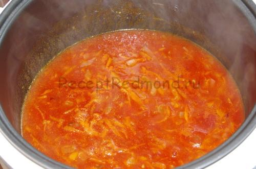 Влийте туди томатний сік і дайте суміші трохи прокипіти під закритою кришкою.