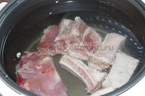 Відваріть бульйон з свинячих ребер на режимі випічка протягом 30 хвилин після закипання. Зніміть піну, посоліть бульйон. Додайте туди перець горошком і лавровий лист. Останніми в чашу відправляється порізану кубиками картоплю (його треба поварити ще 15 хвилин). Я завжди кладу побільше картоплі, частина його розминаю в чашці, щоб за рахунок нього в борщі була гуща.