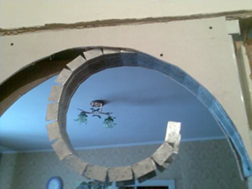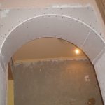 Коли шматки ГКЛ встановлені з двох сторін дверного отвору, нам залишається тільки обшити нижню, торцеву частину. Для цього у нас вже підготовлено два шматки профілю і шматок ГКЛ строго за формою і розмірами. Профіль може бути рівним або спеціально порізаний під радіус арки, а гіпсокартон на торцеву частину арки зігнутий (як зігнути гіпсокартон для подібних робіт, ми вже розповідали раніше), або також мати правильну геометрію.