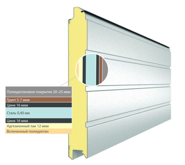 Панель конструкції складається з двох листів оцинкованої сталі, має висоту від сорока до шістдесяти сантиметрів. Простір між листами заповнюється щільним утеплювачем, для чого береться поліуретанова піна або поліестер. Покриття поверхні панелей здійснюється декоративною плівкою ПВХ.