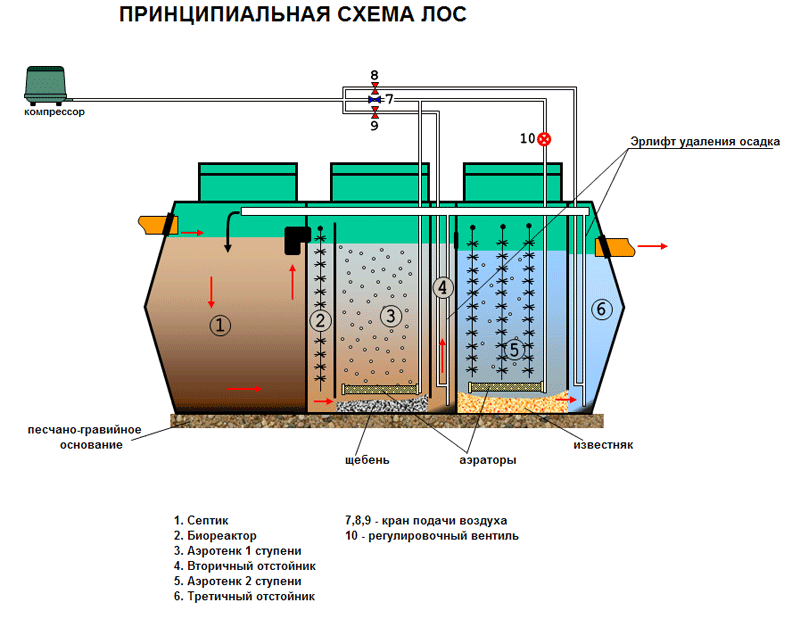 ЛОС, як вже зазначалося вище, являють собою моноблок з безліччю фільтрів очищення, основним з яких є біологічний. Система хороша з багатьох причин, але досить дорога. Очищають стічні нечистоти за допомогою спеціальних аеробних мікробів.