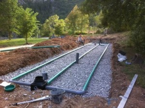 • Прокапывается канава для монтажу труб (кращий варіант — металопластикові), причому необхідно враховувати вкрай важливий нюанс: ухил трубопроводу становить мінімум 100 мм на кожний погонний метр (навіть невелике відхилення на всій протяжності трубопроводу згодом призведе до збоїв у системі та повної її зупинки — влаштовувати її треба, використовуючи інженерний креслення, інакше проблем потім власник будинку вже точно не оберется);