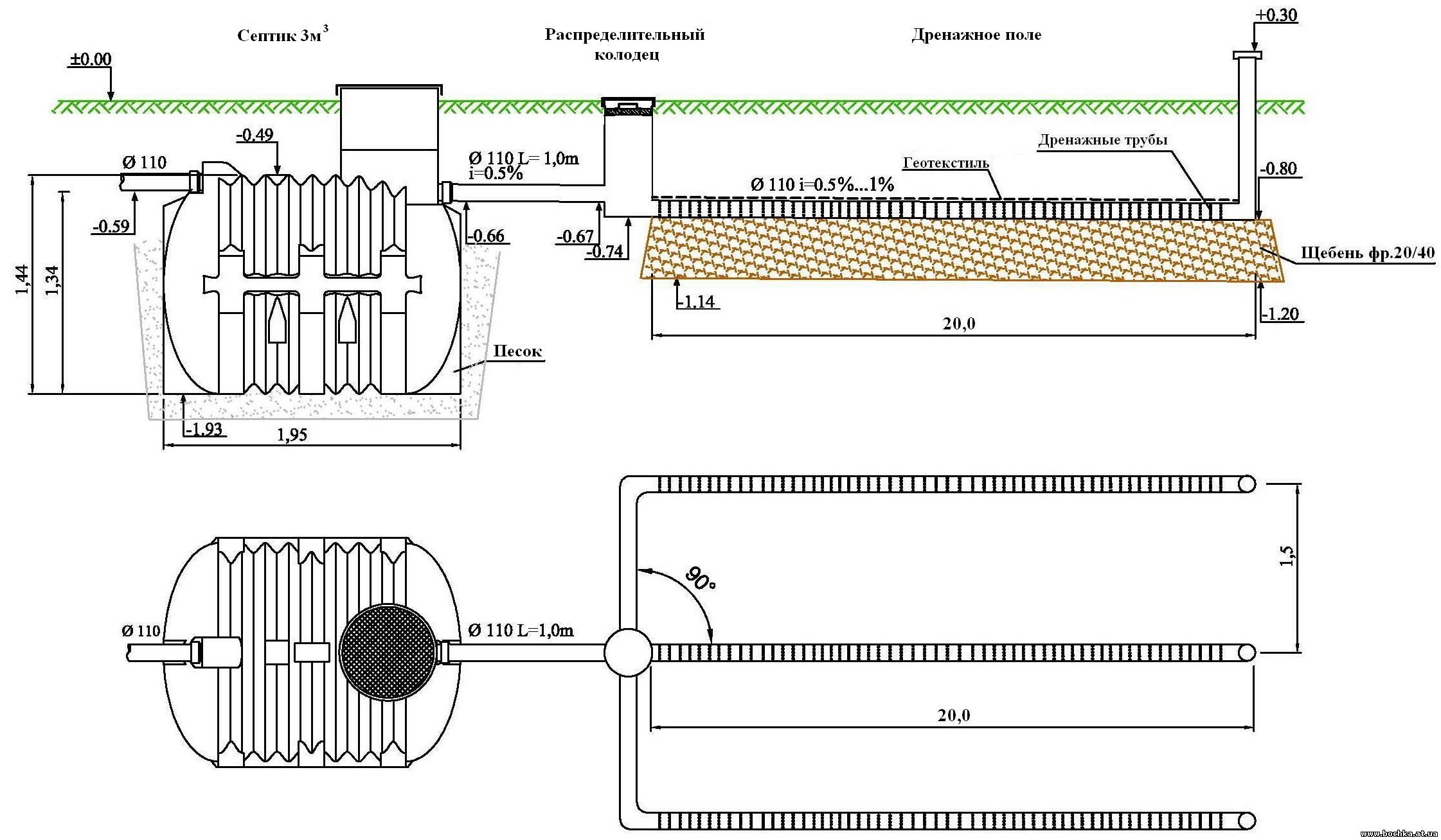 • Важливо правильно розрахувати обсяг септика! В день На людину припадає приблизно 200 літрів (0.2v3) стоків добу. Септик повинен мати камеру, яка вміщала б стоки всього будинку за три доби. Якщо в будинку проживає 4 людини, то він повинен мати мінімальний об’єм 2,4м3 (0,2м2*4*3).