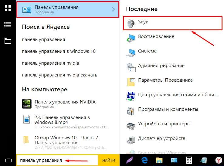 • На комп’ютері або ноутбуці знайти опції налаштувань Звуку. Для цього потрібно зайти у вкладку «Панель управління» або використовувати вхід через панель «Пуск».
