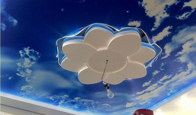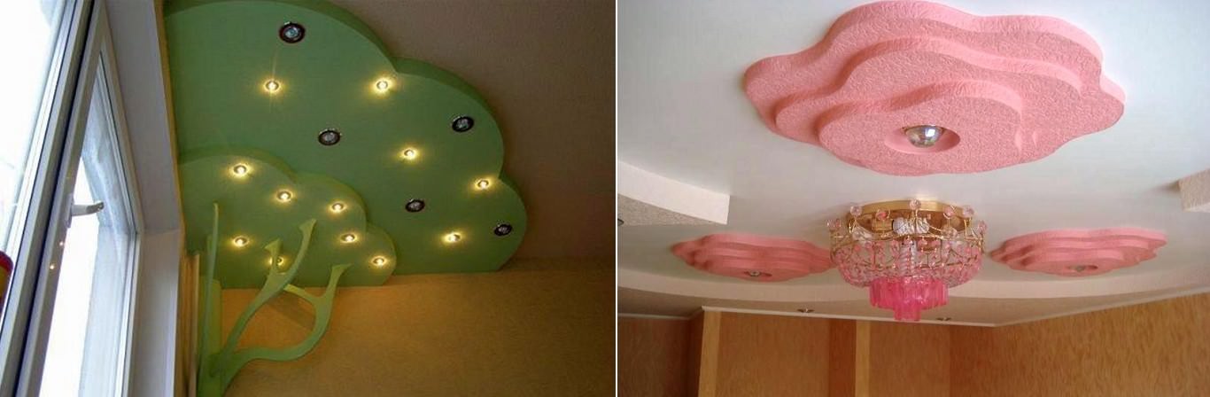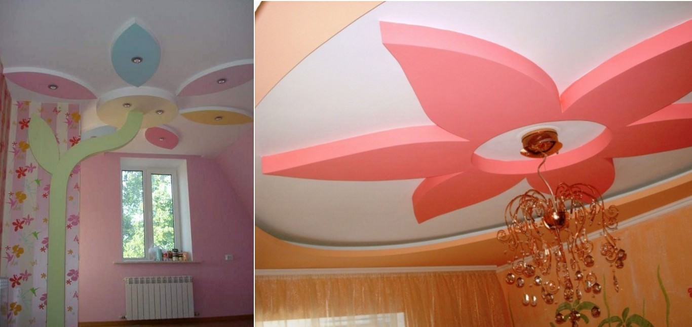 Для дитячих кімнат оптимальним вибором буде нескладна конструкція простого квітки з невеликою кількістю пелюсток переважно круглої форми. Якщо висота стелі не дозволяє робити багаторівневу конструкцію, можна вирішити цю проблему творчо, вирізавши виріб з листа ГКЛ і прикріпивши його прямо до стелі. В такому випадку ефект створить гра не дуже яскравих відтінків.