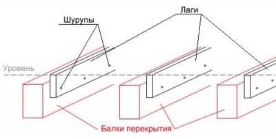 Лаги кріпляться до балок. Але враховуючи, що балки навряд чи мають ідеально рівний рівень, краще кріпити до лаги бічним сторонам балок.