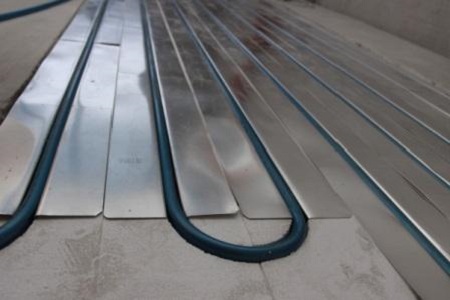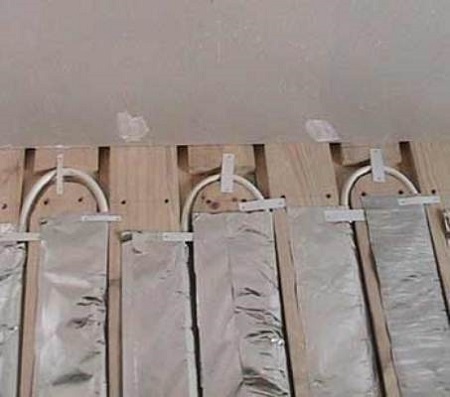У пази настелите спеціальні металеві тепловідбивні пластини або звичайну фольгу — вона буде грати роль своєрідного бар’єра, що перешкоджає розповсюдженню тепла в напрямку землі. Поверх фольги укладіть металопластикові трубки діаметром 16 мм, а для більшого ефекту загорніть всі трубки в ще один шар фольги і її краю закріпіть за допомогою степлера до підлоги. Щоб запобігти випадковому вискакування трубок з пазів, прикріпіть у кількох місцях невеликі металеві пластинки.