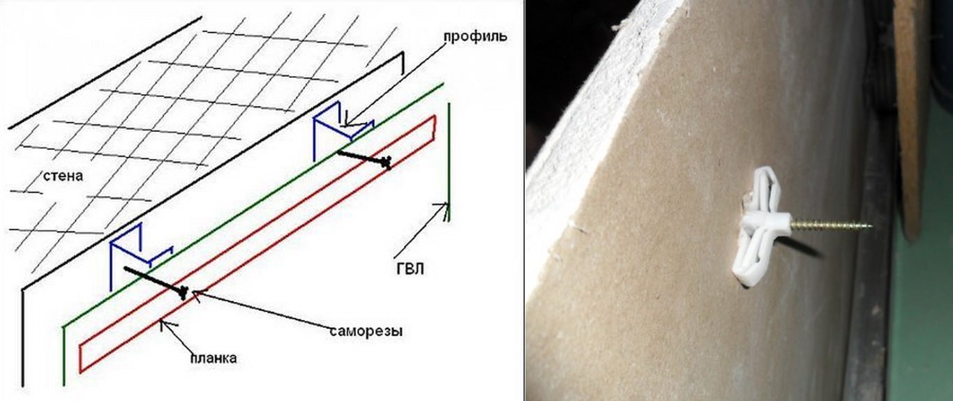 Заставна до обшивки каркаса гіпсокартоном ретельно прикручується до стіни шурупами через дюбель типу «метелик», головки шурупів втоплюють у дошку. Допускається також використовувати анкера з потайною головкою. Для підвищення жорсткості конструкції з’єднайте каркас з деревиною.