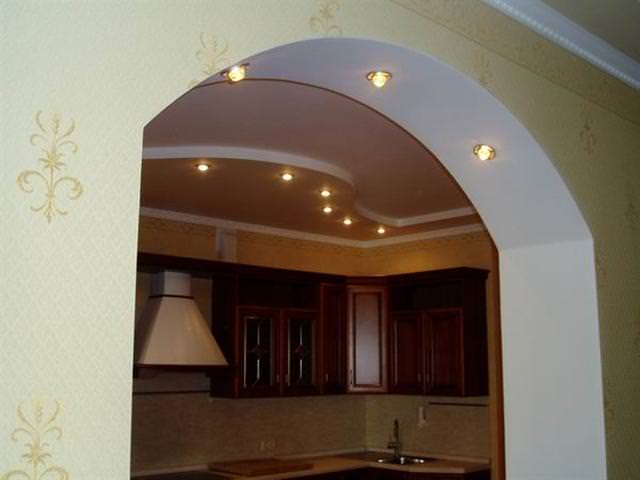 Для кухні, висота стель якої перевищує 2,5 м, незамінною конструкцією стане класична арка з гіпсокартону.