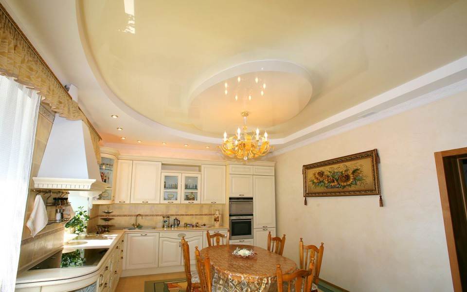 Багато майстрів вважають, що для кухні більше підходять інші варіанти, але не гіпсокартонний стелю. Ми з цим не згодні, так як на основі ГКЛ можна виконати не тільки приголомшливий дизайн, але і влаштувати зональне освітлення кухні, зашити в стелю не тільки неохайне перекриття, яке ми не заштукатурили і не привели в порядок, але і вентиляцію, і витяжку, які так потрібні в кухонному приміщенні. Крім того, якщо є переживання з приводу вологості на кухні і випарів, які з часом можуть пошкодити обробку, то для цього завжди можна використовувати вологостійкий гіпсокартон і спеціальне захисне покриття.