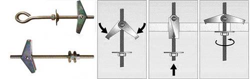 Як видно з назви цього дюбеля, працює він за принципом цього парасольки, тобто розкривається в просторі за плитою, тим самим забезпечуючи надійний упор. Дюбель-парасольку також потребуватиме попереднього свердління отвору перед установкою. Він відмінно підходить для ГК-стелі. Наприклад, при монтажі важкої люстри упори розкриті в просторі за аркушем рівномірно розподілять навантаження на значній площі.