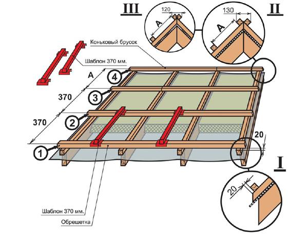 • Решітчаста решетування укладається під шифер, черепицю або металочерепицю, профнастил. У випадку з металочерепицею відстань повинна складати 350 мм, а під шифер та профнастил — 400 мм;
