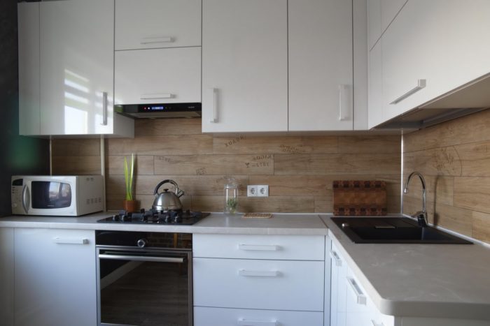 Увага! Для інтер’єрів, які витримані в світлих відтінках, краще всього підійдуть фартухи, зроблені з матового покриття нейтральних натуральних кольорів. У разі якщо приміщення темне, то бажано вибирати глянцевий ламінат світлих тонів.