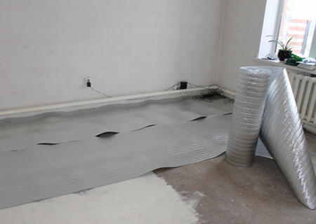 - Монтаж тепловідбивною підкладки. Полотнища покриття скріплюються між собою скотчем. Полотно повинно лягти рівно, без перекосів і збірок. Потім матеріал закріплюється на підлозі за допомогою клею, скотчу або будівельного степлера.