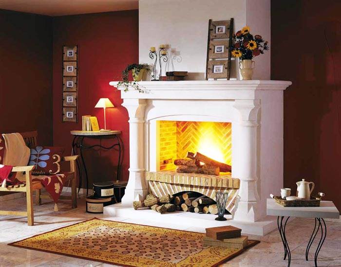 - У великому приміщенні камін розташовується біля поздовжньої стіни, посередині, прикрашається фальш-димарем і декором.
