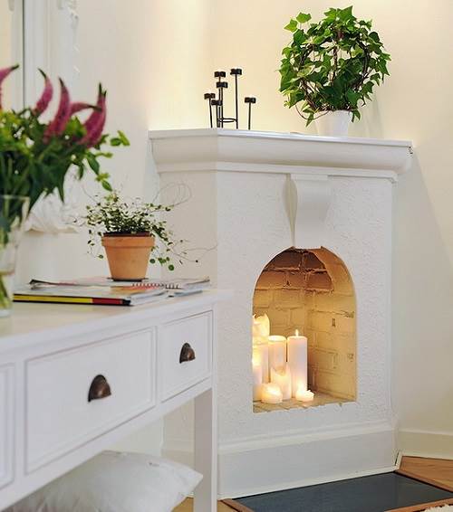 У маленькій квартирі влаштуйте кутовий маленький камін з ГКЛ своїми руками. Він буде доречним на невеликому метражі, і може також виконувати функцію майданчика для сувенірів, скриньок і т. д.