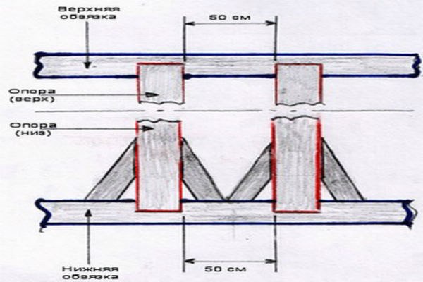 Кріплення верхньої обв’язки проводиться за тим же принципом, що і нижній. Вид збоку представлений на малюнку нижче.