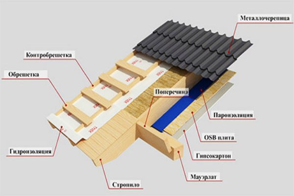 Процес кріплення покрівельного матеріалу не відрізняється якимись нюансами, крім одного: верхня частина листів повинна надати під покрівельним матеріалом основної будівлі. Для цього може знадобитися зняти частина кріплень. Приблизна схема покрівельного «пирога» представлена на малюнку нижче.