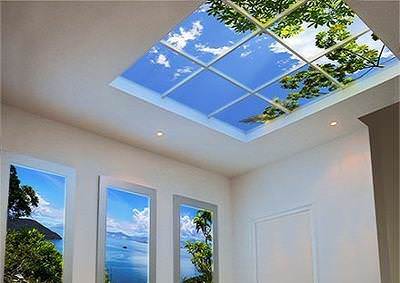 - Стеля-віконце. Все просто: в середині стелі робиться іншим рівнем таке віконце, а ось в ньому повинна бути вінілова картинка з зображенням того, що теоретично можна побачити у верхньому вікні. Гра хмар, панорама міста або космічні дали. Фантазії немає меж!