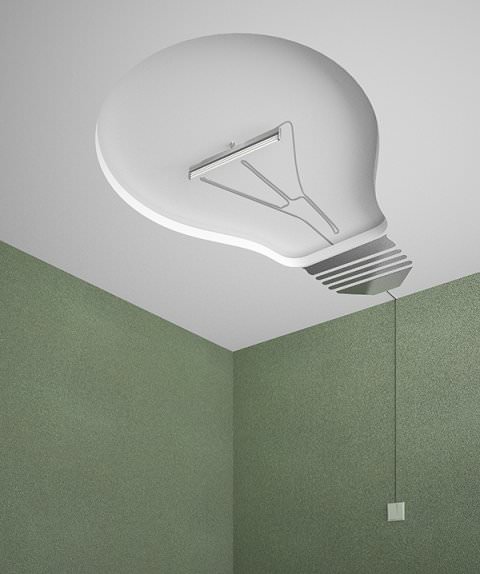 - Стеля з великою лампочкою. Такий спосіб підійде для спальні або іншого невеличкої кімнатки. Зовні це виглядає так: у певної частини стелі є поглиблення за формою нагадує велику лампу. В цьому ж поглибленні вбудована освітлювальна система. Ідеальний така стеля для кабінету, так як нагадує офісний стиль.