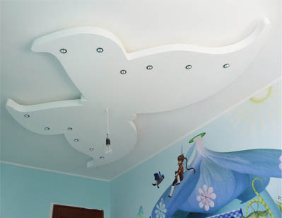 Або прикладом таких розробок може бути дерево: особливої нішею у вигляді товстого стовбура робиться виїмка в стіні. Це можуть бути вбудовані полички, місце для фото і т. д. А вже крона дерева вінчає стелю, зрозуміло – дворівневий. Вартість такого красивого стелі з гіпсокартону буде висока, адже робота дуже складна, і підготовка до неї серйозна.