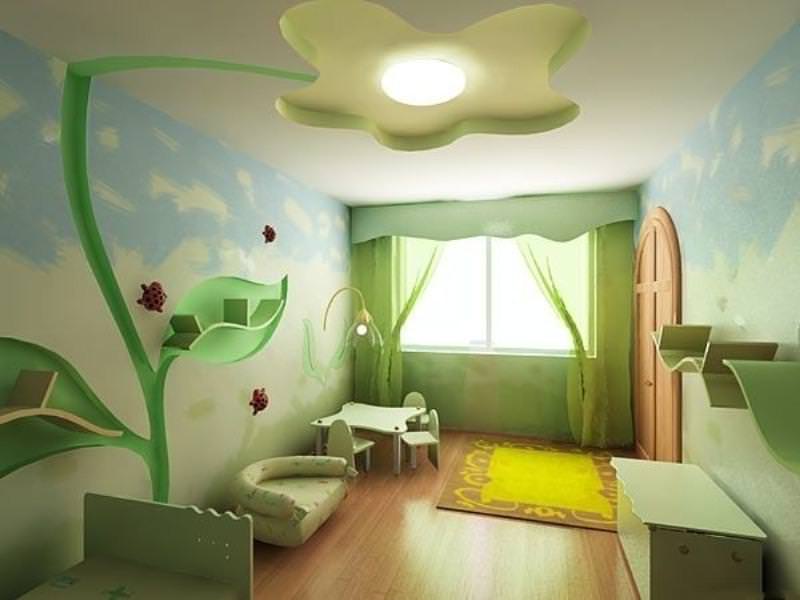 Приміром, у дитячій часто роблять композиції, які починаються ще внизу стіни, а закінчуються на стелі. Це може бути квітка, стебло якого йде крізь стіну тонкої нішею, а сам бутон об’ємний вже відкривається на стелі.